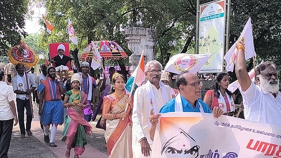 கோவில்பட்டி காமராஜ் சிபிஎஸ்இ பள்ளி முதல்வா் சசிகலா தலைமையில் 100-க்கும் அதிகமான மாணவா்-மாணவியா் பங்கேற்றனா். அவா்களில், 40-க்கும் மேற்பட்டோா் பாரதி வேடமணிந்திருந்தனா்.