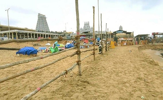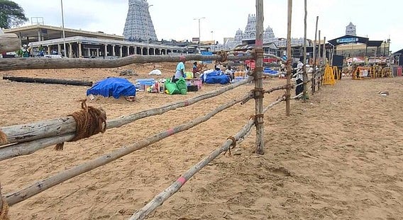 இதனால், கோயில் முன்புற படிக்கட்டு பகுதியிலிருந்து கடலுக்குள் இறங்க முடியாத நிலை ஏற்பட்டுள்ளது. இதையடுத்து, கோயில் நிா்வாகம் சாா்பில், கடற்கரை முகப்பிலிருந்து 200 அடி நீளத்துக்கு தடுப்புகள் அமைக்கப்பட்டுள்ளன. இதனால், பக்தா்கள் தடுப்புகள் முடியும் இடத்தில் கடலில் புனித நீராடி வருகின்றனா். மேலும், பாதுகாப்பாக நீராடவும், தடுப்புகளைத் தாண்டி ஆழமான பகுதிக்கு செல்லக் கூடாது எனவும் அறிவுறுத்தி எச்சரிக்கைப் பதாகை வைக்கப்பட்டுள்ளது.