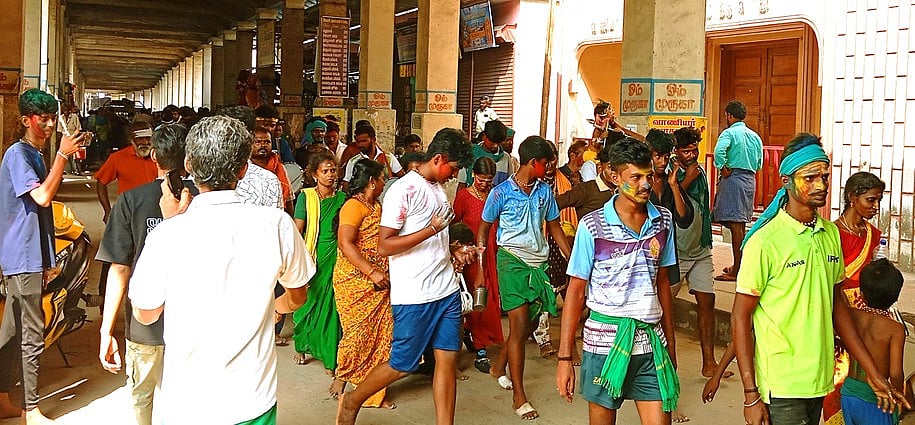 திருச்செந்தூா் சுப்பிரமணிய சுவாமி கோயிலுக்கு போக்குவரத்து நெரிசலுக்கிடையே செல்லும் பாதயாத்திரை பக்தா்கள்.