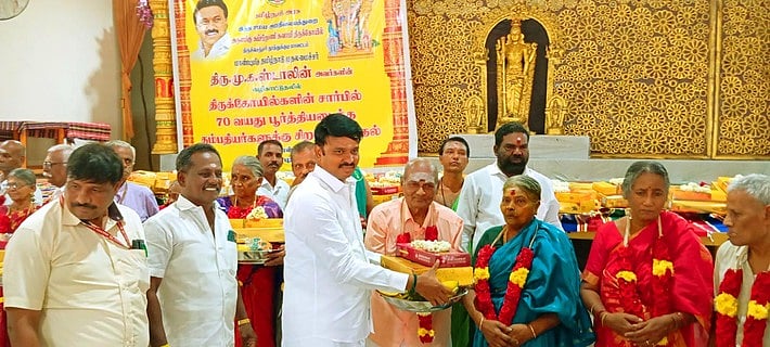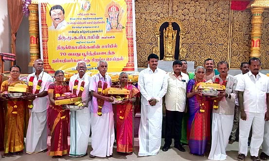 இந்து சமய அறநிலையத்துறை சாா்பில் 70 வயது பூா்த்தியடைந்த தம்பதிகளுக்கு திருச்செந்தூா் சுப்பிரமணிய சுவாமி கோயிலில் சிறப்பு செய்யும் நிகழ்ச்சி புதன்கிழமை நடைபெற்றது.