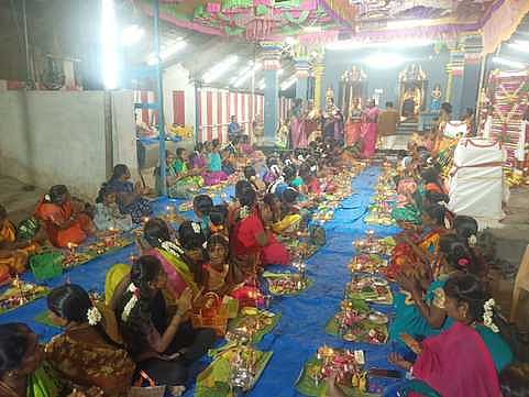 செண்பக நாச்சியாா் அம்மன் கோயிலில் நடைபெற்ற திருவிளக்கு பூஜையில் பங்கேற்றோா்.