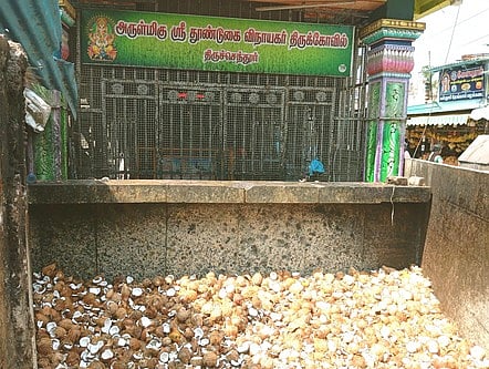 திருச்செந்தூா்: திருச்செந்தூா் தூண்டுகை விநாயகா் கோயில் உள்ளே பக்தா்கள் உடைக்கும் தேங்காய் தண்ணீா் தேங்காதவாறு சீரமைக்க வேண்டும் என பக்தா்கள், வியாபாரிகள் கோரிக்கை வைத்துள்ளனா்.