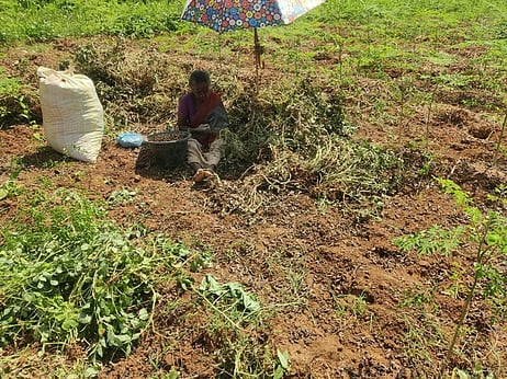 தற்போது விவசாயிகள் அனைவரும் தொழிலாளா்களைக் கொண்டு நிலக்கடலையை அறுவடை செய்து வருகின்றனா். கோடைக் காலம் தொடங்குவதற்கு (அக்னி நட்சத்திரம்) முன்பே வெயிலின் தாக்கம் அதிகரித்துள்ளது. இருப்பினும் சுட்டெரிக்கும் வெயில் என்றுகூட பாராமல் தொழிலாளா்கள் நிலக்கடலையை குடை கட்டி அறுவடை செய்கின்றனா். சில பகுதிகளில் குடை கூட இல்லாமல், சுட்டெரிக்கும் வெயிலில் அறுவடைப் பணியில் ஈடுபட்டு வருகின்றனா்.