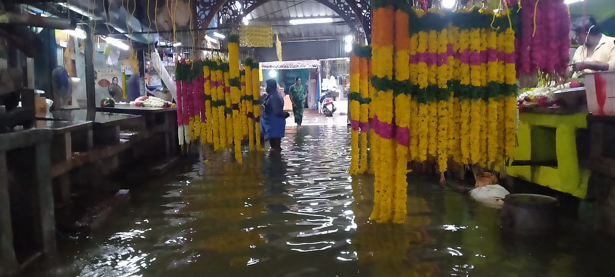 புதுக்கோட்டை நகரம் மற்றும் சுற்றுவட்டாரப் பகுதிகளில் சனிக்கிழமை நள்ளிரவில் தொடங்கி விடிய விடிய பெய்த கனமழையால், நகரிலுள்ள கோயில், சாலைகள், பூ மார்க்கெட் பகுதிகளில் வெள்ளம் பெருக்கெடுத்து ஓடுகிறது.