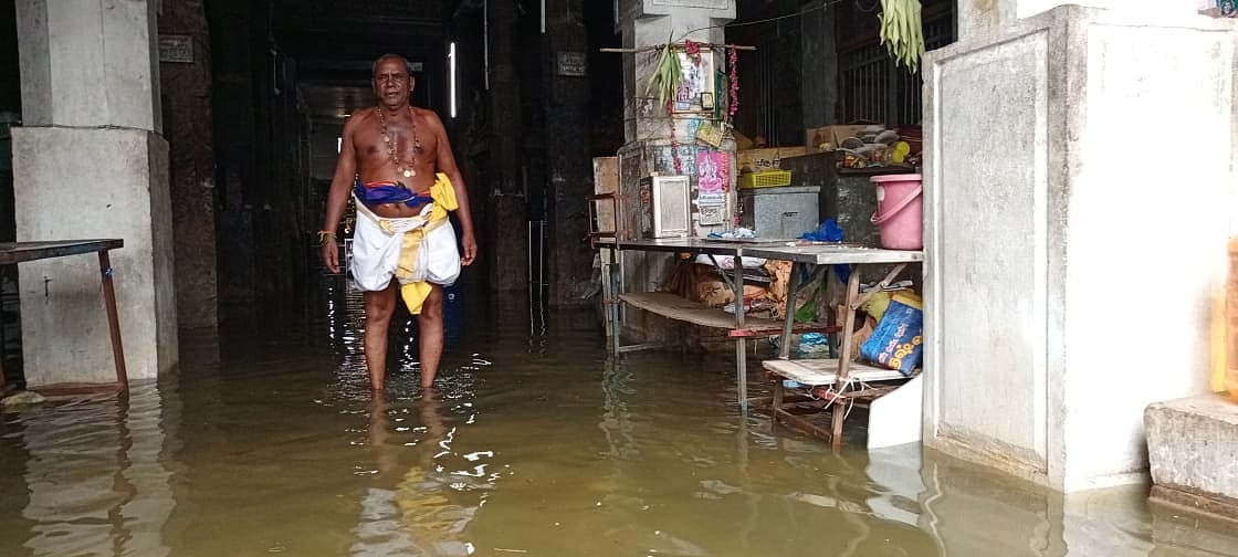 இதனால் நகரின் மையப்பகுதியிலுள்ள பல்லவன் குளம் நிரம்பி வழிந்து அருகேயுள்ள சாந்தநாதர் கோவிலுக்குள் வெள்ளம் புகுந்தது. அருகேயுள்ள பூ மார்க்கெட் பகுதியிலும் முழங்கால் அளவு தண்ணீர் தேங்கியுள்ளது. இதேபோல, கீழ 3, கீழ 4 வீதிகளிலும் மழைநீர் பெருக்கெடுத்து ஓடுகிறது.