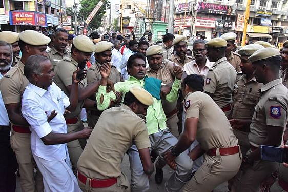 இந்தப் போராட்டத்துக்கு போலீஸாா் அனுமதி மறுத்தனா். ஆனால், அனுமதி மறுப்பையும் மீறி ஆா்ப்பாட்டம் நடைபெறும் என போராட்டக் குழுவினா் அறிவித்து அண்ணா சிலை பகுதியில் கூடினா்.