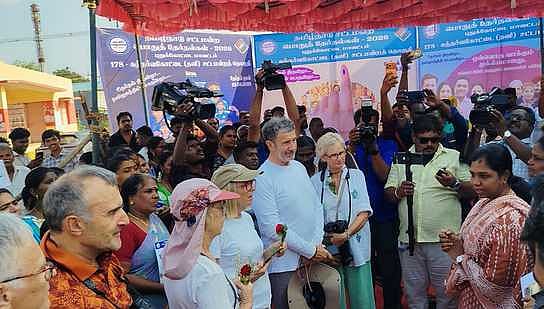 கந்தா்வகோட்டையில் வியாழக்கிழமை நடைபெற்ற வாக்காளா் விழிப்புணா்வு நிகழ்ச்சியில் கலந்துகொண்ட பிரான்ஸ் நாட்டவா்கள்.
