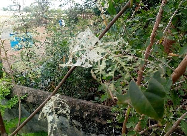 மேலும், பல இலைகள் முற்றிலுமாக அரிக்கப்பட்டு, காம்பும், நரம்பும் மட்டுமே எஞ்சியுள்ளன.