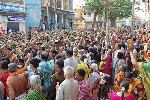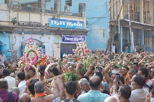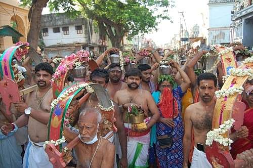 தஞ்சாவூரில் புன்னைநல்லூர் மாரியம்மன் கோயிலுக்கு செவ்வாய்க்கிழமை காலை பால் குடம் எடுத்து சென்ற பக்தர்களில் ஒரு பகுதியினர்.