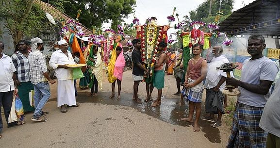 காசவளநாடுபுதூரில் மொஹரம் பண்டிகையையொட்டி, புதன்கிழமை எடுத்து வரப்பட்ட பஞ்சா எனப்படும் கரகத்தை வழிபட்ட இந்துக்கள்.