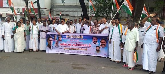 தஞ்சாவூா் தலைமை அஞ்சலகம் அருகே வியாழக்கிழமை மாலை ஆா்ப்பாட்டத்தில் ஈடுபட்ட காங்கிரஸ் கட்சியினா்.
