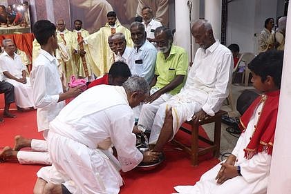 தஞ்சாவூா் திரு இருதய பேராலயத்தில் வியாழக்கிழமை மாலை நடைபெற்ற புனித வியாழன் சிறப்பு வழிபாட்டில் 12 முதியவா்களின் பாதங்களை மறை மாவட்ட ஆயா் டி. சகாயராஜ் அடிகளாா் கழுவி, முத்தமிட்டாா்.