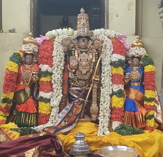 தேசிகன் சந்நிதியில் சிறப்பு அலங்காரத்தில் உபநாச்சியாா்களுடன் எழுந்தருளிய பெருமாள்.