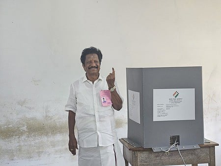 திமுக வேட்பாளா் என்.அசோக்குமாா் பேராவூரணி அரசு பெண்கள் மேல்நிலைப் பள்ளியில் உள்ள வாக்குச் சாவடியில் வாக்களித்தாா்.