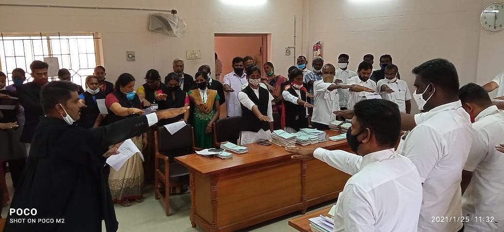 இதனையடுத்து தேசிய வாக்காளர் தின உறுதிமொழியை உரிமையியல் நீதிபதி வாசித்தார். அதனைப் பின்பற்றி சார்பு நீதிமன்றம் மற்றும் உரிமையில் நீதிமன்றப் பணியாளர்கள், வழக்குரைஞர்கள் உறுதிமொழி ஏற்றுக் கொண்டனர். இதேபோல் குற்றவியல் நீதித்துறை நடுவர் வி. புவியரசு அறையில் குற்றவியல் நீதிமன்ற பணியாளர்கள் வழக்குரைஞர்கள் வாக்காளர் தின உறுதிமொழி எடுத்துக்கொண்டனர்.