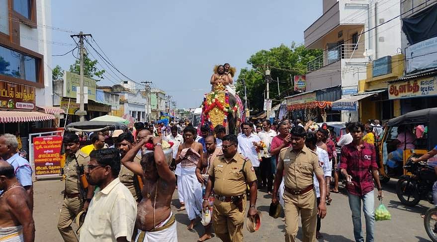 பரிவாரங்கள் புடைசூழ மேள தாள முழங்க சன்னதி வீதி, வழியாக திருக்கோயில்
