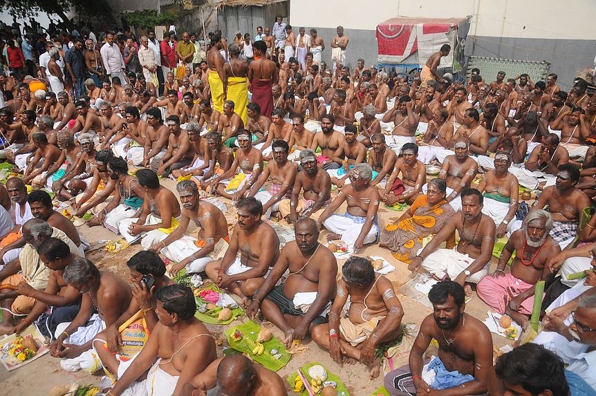 ஆடி அமாவாசை நாளான ஞாயிற்றுக்கிழமை ஸ்ரீரங்கம் கருட மண்டபத்தில் முன்னோா்களுக்கு தா்ப்பணம் செய்த பொதுமக்கள்.