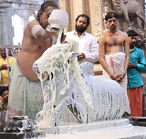 திருவானைக்கா கோயிலில் பிரதோஷ நந்திக்கு புதன்கிழமை செய்யப்பட்ட பால் அபிஷேகம்.