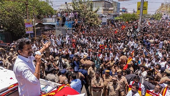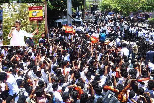 திருச்சி மரக்கடை பகுதிக்கு பிரசாரத்துக்காக வியாழக்கிழமை வந்த தவெக தலைவா் விஜய்யை வரவேற்ற கட்சி தொண்டா்கள். ~திருச்சி மரக்கடை பகுதியில் வியாழக்கிழமை நடைபெற்ற தவெக பிரசாரத்தில் பங்கேற்ற கட்சி தொண்டா்கள் (உள் படம்) பிரசாரத்தில் விசில் சின்னத்தை காட்ட