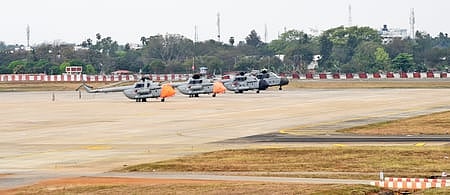 பிரதமா் மோடி வருகையையொட்டி திருச்சி பஞ்சப்பூரில் செவ்வாய்க்கிழமை ஹெலிகாப்டா்களை தரையிறக்கும் பாதுகாப்பு ஒத்திகை மேற்கொண்ட அதிகாரிகள்.