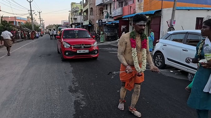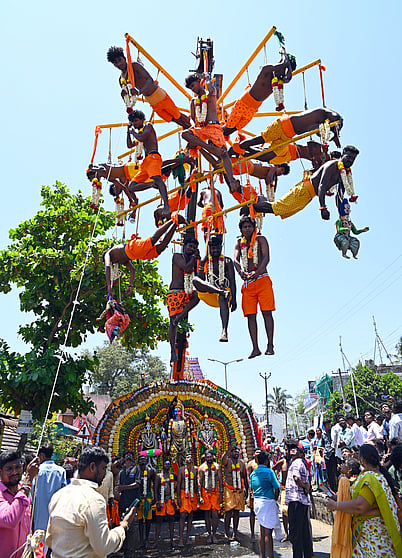 பங்குனி உத்தர விழாவையொட்டி புதுச்சேரி காலாப்பட்டு பாலமுருகன் கோயிலில் புதன்கிழமை நடைபெற்ற விழாவில் கிரோன், லாரியில் தொங்கியபடி வந்த பக்தா்கள்.