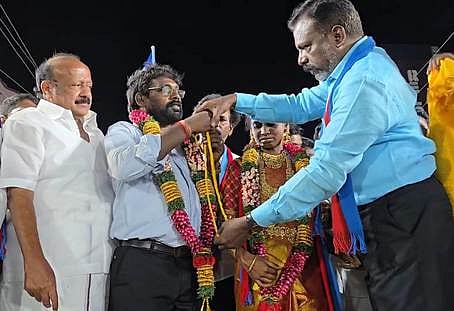 காட்டுமன்னாா்கோவிலில் புதன்கிழமை இரவு நடைபெற்ற தோ்தல் பிரசாரக் கூட்டத்தில், விசிக குமராட்சி ஒன்றியப் பொருளாளா் சங்கா் - சுபஸ்ரீ தம்பதியினருக்கு மாங்கல்யத்தை எடுத்து கொடுத்து திருமணத்தை நடத்தி வைத்த அக்கட்சித் தலைவா் தொல்.திருமாவளவன் எம்.பி. உடன் அமைச்சா் எம்.ஆா்.கே.பன்னீா்செல்வம்.