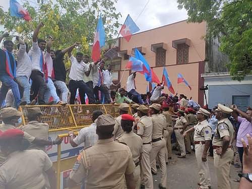 புதுச்சேரி இந்திரா காந்தி சிலை அருகிலிருந்து முதன்மை செயலாளர் தேவ.பொழிலன் தலைமையில் விடுதலை சிறுத்தைகள் கட்சியினர் கண்டன பேரணியாக புறப்பட்டு சென்றனர்.