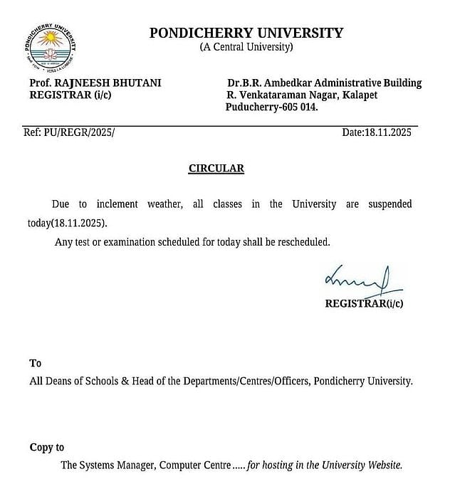 புதுவை மத்திய பல்கலைக் கழகத்தில் இன்று(நவ. 18) நடைபெறவிருந்த தேர்வுகள் மழை காரணமாக ஒத்திவைக்கப்பட்டுள்ளன.