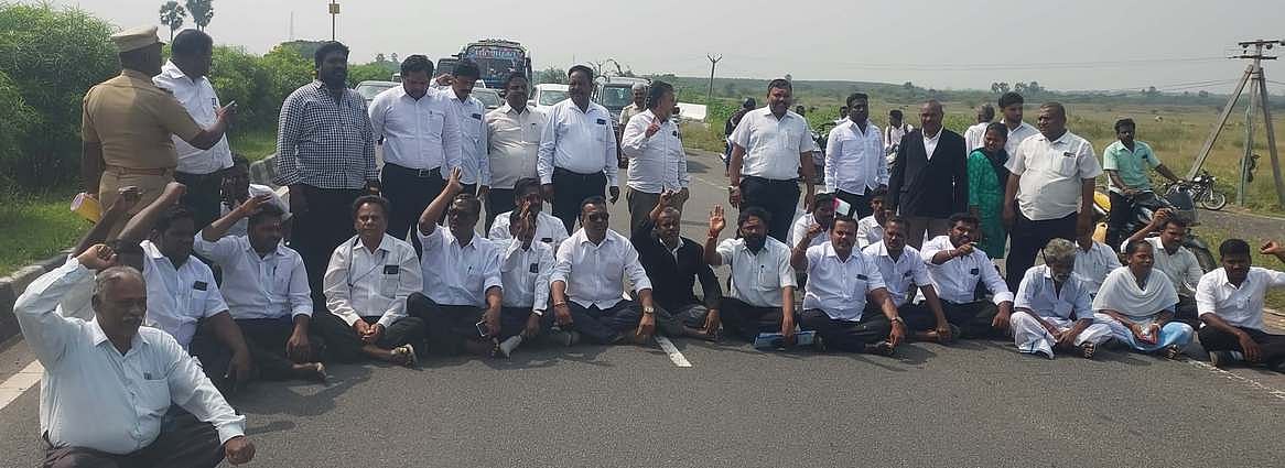 20 நிமிஷங்கள் மறியல் போராட்டம் நடைபெற்ால் சாலையின் இருபுறமும் வாகனங்கள் அணிவகுத்து நின்றன. தொடா்ந்து போலீஸாா் வழக்குரைஞா்களிடம் பேசி, மறியலைக் கைவிடச் செய்தனா். இதையடுத்து வழக்குரைஞா்கள் கலைந்து சென்றனா்.