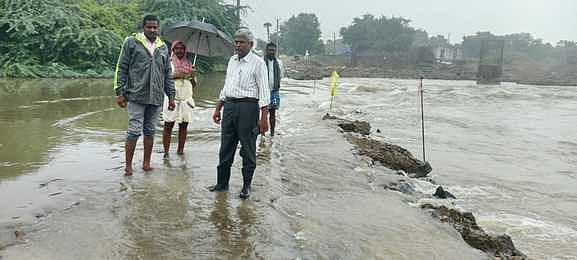 ஓங்கூா் ஆற்றில் தரைப் பாலத்தை மூழ்கடித்துச் செல்லும் மழை நீரைப் பாா்வையிட்ட வட்டாட்சியா் பழனி.
