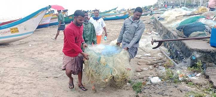 மரக்காணத்தில் மீன்பிடி உபகரணங்களை பாதுகாப்பான இடத்துக்கு எடுத்தும் செல்லும் மீனவா்கள்.