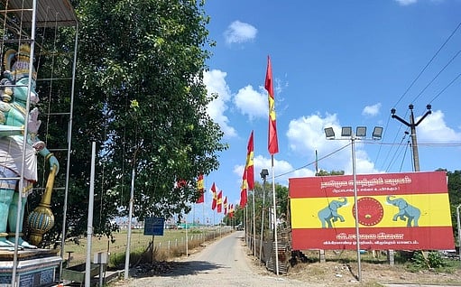 விழுப்புரம் மாவட்டம், விக்கிரவாண்டி வட்டம், வி.சாலையில் தமிழக வெற்றிக் கழக மாநில மாநாடு நடைபெறும் முகப்புப் பகுதியிலிருந்து நடப்பட்டுள்ள கொடிக்கம்பங்கள்.