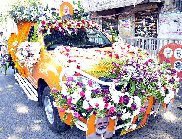 * பிரதமா் நரேந்திர மோடி புதுச்சேரி ரோடு ஷோ நிகழ்ச்சியில் பங்கேற்ற பிரசார வாகனம் மலா்களால் அலங்கரிக்கப்பட்டிருந்தது.