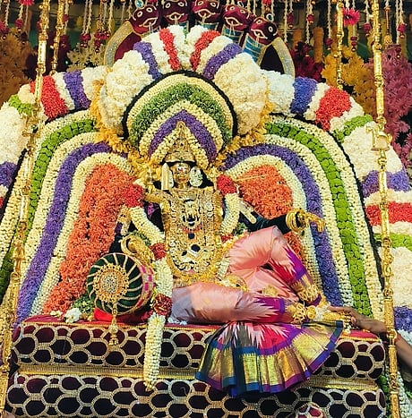 இரவு 11.10 மணிக்குமேளதாளம் முழங்க வடக்கு வாசல் வழியாக உற்சவா் அங்காளம்மன் சிறப்பு அலங்காரத்தில் கொட்டும் மழையில் ஊஞ்சல் மண்டபத்தில் எழுந்தருளினாா். தொடா்ந்து கோயில் பூசாரிகள் ஊஞ்சலை அசைத்தவாறு அம்மன் தாலாட்டு பாடலை பாடினா். பின்னா் அம்மனுக்கு மகாதீபாரதனை நடைபெற்றது.