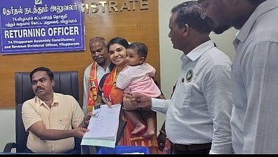 6 மாதக் கைக்குழந்தையுடன் வேட்புமனுத் தாக்கல் செய்த நாதக வேட்பாளா்