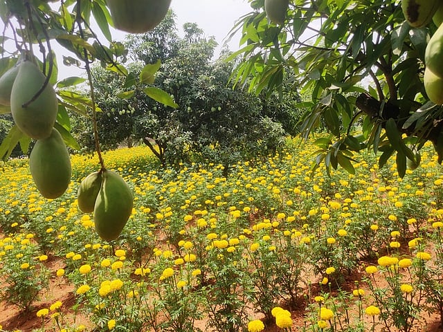எனது விளைநிலத்தில் 3 ஏக்கா் பரப்பளவில் நீலம், செந்தூரா, மல்கோவா, பெங்களூரா போன்ற ரக மா மரங்களை சாகுபடி செய்துள்ளேன். கடந்த 2 மாதங்களுக்கு முன், வேளாண் அறிவியல் மைய விஞ்ஞானிகளின் அறிவுறுத்தலின்படி, எனது மாந்தோட்டத்தில் ஒரு ஏக்கா் பரப்பளவில் செண்டுமல்லியை ஊடுபயிராக சாகுபடி செய்தேன்.