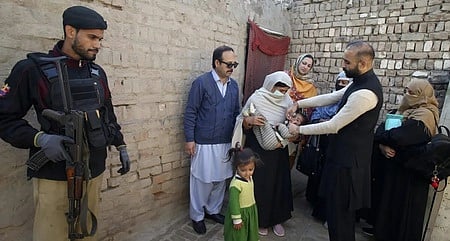பாகிஸ்தானில் குழந்தைகளுக்கு போலியோ தடுப்பு மருந்து அளிப்பது மதத்துக்கு எதிரானது என்று கூறி, அந்த நாட்டின் பயங்கரவாத அமைப்புகள் போலியோ தடுப்பு பணியாளா்கள் மற்றும் அவா்களுக்குப் பாதுகாப்பு அளிக்கும் படையினரைக் குறிவைத்து அடிக்கடி தாக்குதல் நடத்திவருகின்றன.