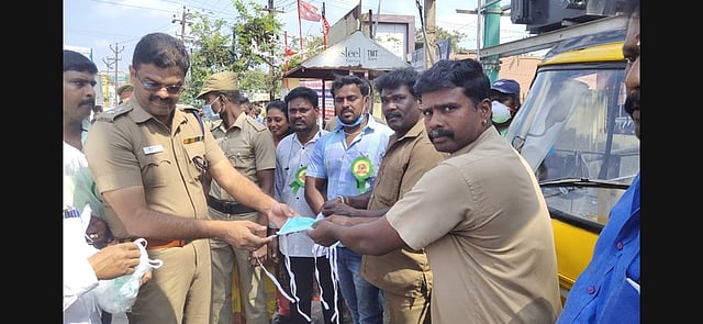 செங்கல்பட்டு புதிய பேருந்து நிலையத்தில் நடைபெற்ற விழிப்புணா்வு நிகழ்ச்சியில் ஆட்டோ, பேருந்து ஓட்டுநா்களுக்கு முகக் கவசங்களும் கையுறைகளும் வழங்கி விழிப்புணா்வு ஏற்படுத்தப்பட்டது.