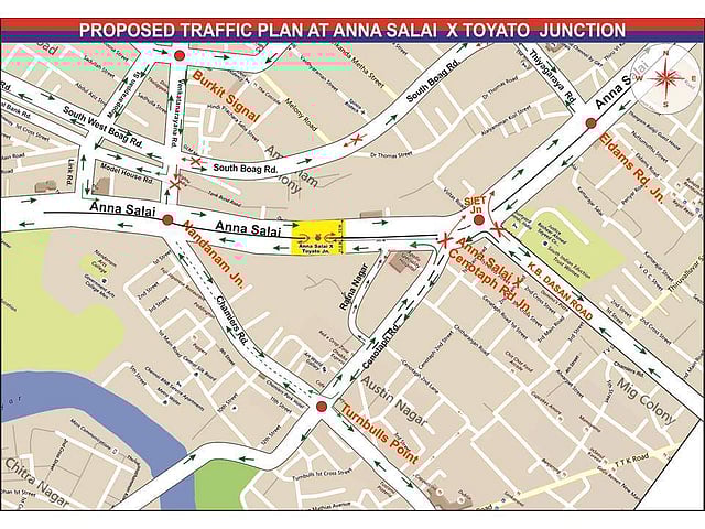 3. பாரதிதாசன் சாலையில் இருந்து தேனாம்பேட்டை செல்லும் வாகனங்கள், அண்ணாசாலை மற்றும் பாரதிதாசன் சாலை சந்திப்பில் இடதுபுறம் சென்று, சைதாப்பேட்டை நோக்கி நேராக 300 மீட்டர் தூரம் சென்று டோயாட்டோவுக்கு முன்னால் “U திருப்பம்” திரும்பி அவர்களின் இலக்கை அடையலாம்.