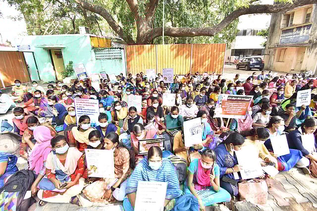 கரோனா காலத்தில் ஒப்பந்த முறையில் பணியமர்த்தப்பட்ட செவிலியர்கள் பணி நிரந்தரம் செய்யக்கோரி சென்னையில் போராட்டத்தில் ஈடுபட்டுள்ளனர்.