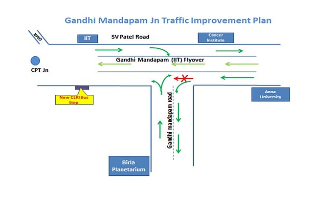 2. காந்தி மண்டபம் சர்வீஸ் சாலையில் நுழையும் வாகனங்கள் காந்தி மண்டபம் சந்திப்பில் கட்டாயமாக இடதுபுறம் திரும்ப வேண்டும், மேலும் அவ்வாகனங்கள் நேராக (மத்திய கைலாஷ் நோக்கி) செல்ல அனுமதிக்கப்படாது.