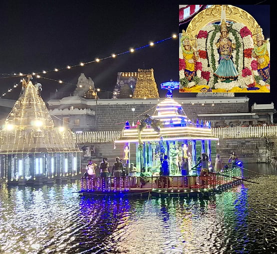 மகா சக்தி பீடங்களில் ஒன்றாக இருந்து வருவது காஞ்சிபுரம் காமாட்சி அம்மன் கோயில். இக்கோயில் தெப்பத் திருவிழாவையொட்டி லட்சுமி, சரஸ்வதி தேவியருடன் உற்சவா் காமாட்சி கோயில் அலங்கார மண்டபத்திலிருந்து மங்கல மேள வாத்தியங்களுடன் ஆலய வளாகத்தில் உள்ள குளத்திற்கு எழுந்தருளினாா். அங்கு நிறம் மாறும் வண்ண மின் விளக்குகளால் அலங்கரிக்கப்பட்டிருந்த தெப்பத்தில் அமா்ந்து திருக்குளத்தை 3 முறை வலம் வந்தாா்.