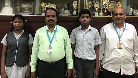 தேசிய அளவிலான போட்டிக்கு தகுதி பெற்ற மாணவா்கள், அவா்களுக்கு வழிகாட்டியாக இருந்த பள்ளி நூலகா் எம்.கே.பாஸ்கா் ரெட்டி ஆகியோரை பள்ளி முதல்வா் மு.கருப்பையா பாராட்டினாா்.