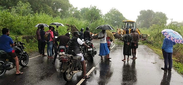 இதனால் சுமார் 1 மணிநேரத்திற்கும் மேலாக போக்குவரத்து பாதிக்கப்பட்டது. இதுபற்றி தகவல் அறிந்த வருவாய்த்துறை அதிகாரிகள், ஜேசிபி உதவியோடு மரத்தை அகற்றும் பணியில் ஈடுபட்டனர்.