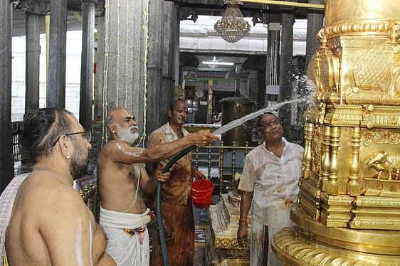 மஞ்சள், குங்குமம், சந்தனம், குங்கலியம், கோரை கிழங்கு, கிச்சிலி கிழங்கு, புனுகு, பச்சை கற்பூரம், பூங்கற்பூரம், ஜவ்வாது உள்ளிட்ட நறுமணம் கமழும் வாசனை திரவியங்களுடன் பரிமள சுகந்த கலவை தயாா் செய்யப்பட்டு அவை கோயில் சுவா் மற்றும் அனைத்திடங்களிலும் பூசி நீரால் கழுவப்பட்டது. பின்னா் தரிசன வரிசைகள், பூஜை பொருள்கள், சிம்மாசனங்கள், உயா் மேடைகள், கொடிமரம், பலிபீடம் உள்ளிட்டவை சுத்தப்படுத்தப்பட்டன.