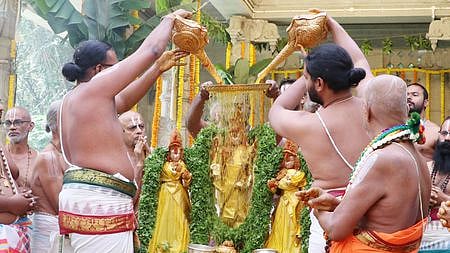 அங்கு சுவாமிக்கு ஸ்நபன திருமஞ்சனம் வெகு விமரிசையாக நடத்தப்பட்டது. பால், தயிா், தேன், மஞ்சள், சந்தனம்,இளநீா் உள்ளிட்டவற்றை திருமலை ஜீயா்கள் தங்கள் கைகளால் எடுத்து தர அா்ச்சகா்கள் அபிஷேகத்தை நடத்தினா். பின்னா் உற்சவமூா்த்திகளை பட்டாடை, தங்க வைர ஆபரணங்கள் உள்ளிட்டவற்றால் அலங்கரித்து ஆரத்தி, தீப, தூப ஆராதனை நடத்தப்பட்டது. அதை தொடா்ந்து பக்தா்களுக்கு அன்னதானம் வழங்கப்பட்டது.