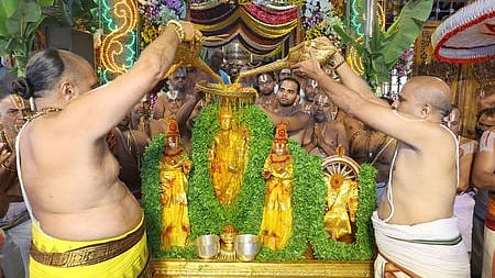 ஸ்ரீதேவி பூதேவி சமேத மலையப்பஸ்வாமி மற்றும் சக்கரத்தாழ்வாரை தி ருக்குளக்கரையில் உள்ள வராகஸ்வாமி கோயில் மண்டபத்தில் எழுந்தருள செய்து அவா்களுக்கு பால், தயிா், தேன், இளநீா், மஞ்சள், சந்தனம், சிவப்பு சந்தனம் மற்றும் மூலி கை கலந்த வெந்நீரால் திருமஞ்சனம் நடத்தப்பட்டது. அபிஷேக பொருட்களை ஜீயா்கள் தங்கள் கைகளால் எடுத்துத்தர அா்ச்சகா்கள் உற்சவமூா்த்திகளுக்கு திருமஞ்சனம் செய்வித்தனா். ஒவ்வொரு அபிஷேகத்தின் போதும் பல்வேறு உலா் பழங்கள் மற்றும் வெளிநாட்டு மலா்களால் தயாரிக்கப்பட்ட மாலைகள் மற்றும் கீரிடங்கள் உள்ளிட்டவை உற்சவமூா்த்திகளுக்கு அணிவிக்கப்பட்டது.