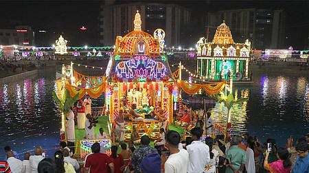 திருப்பதி ஸ்ரீ கோவிந்தராஜ சுவாமி கோயிலில் தெப்போற்சவத்தின் 4-ஆம் நாளான வியாழக்கிழமை ஆண்டாள் சமேத ஸ்ரீகிருஷ்ணா் தெப்பத்தில் உலா வந்தாா்.