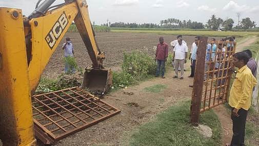 இந்த உத்தரவின் பேரில், வட்டாட்சியா் சண்முகம் தலைமையில் பொக்கலைன் இயந்திரம் மூலம் இரும்பு கேட்டை அகற்றினா் (படம்).