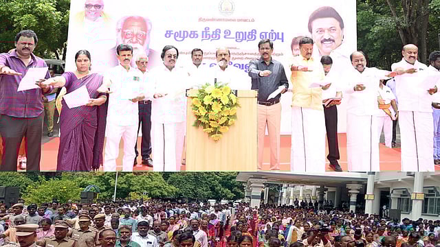 இதைத் தொடா்ந்து அமைச்சா் எ.வ.வேலு தலைமையில் சமூக நீதிநாள் உறுதிமொழியை அனைவரும் ஏற்றனா்.